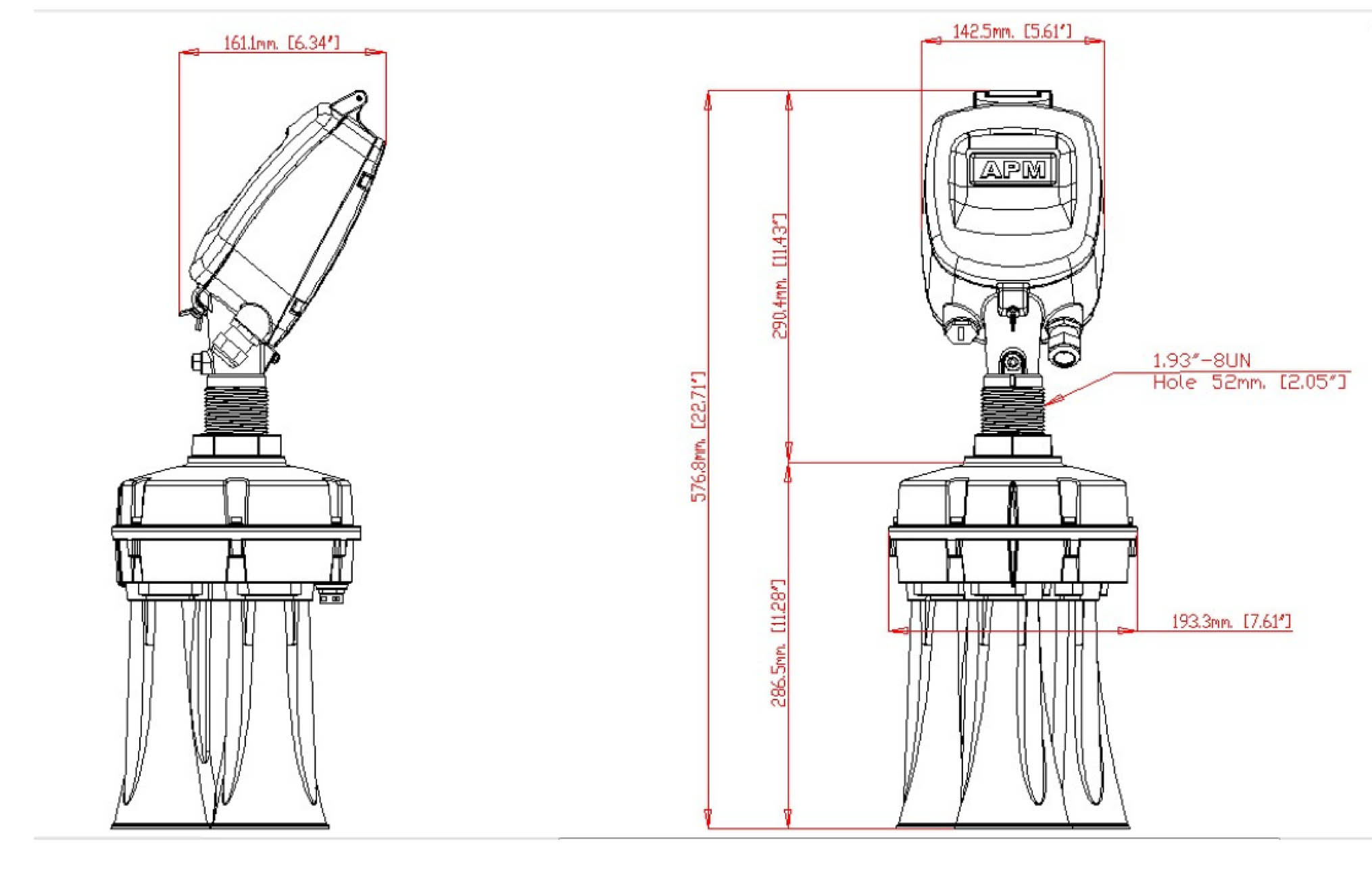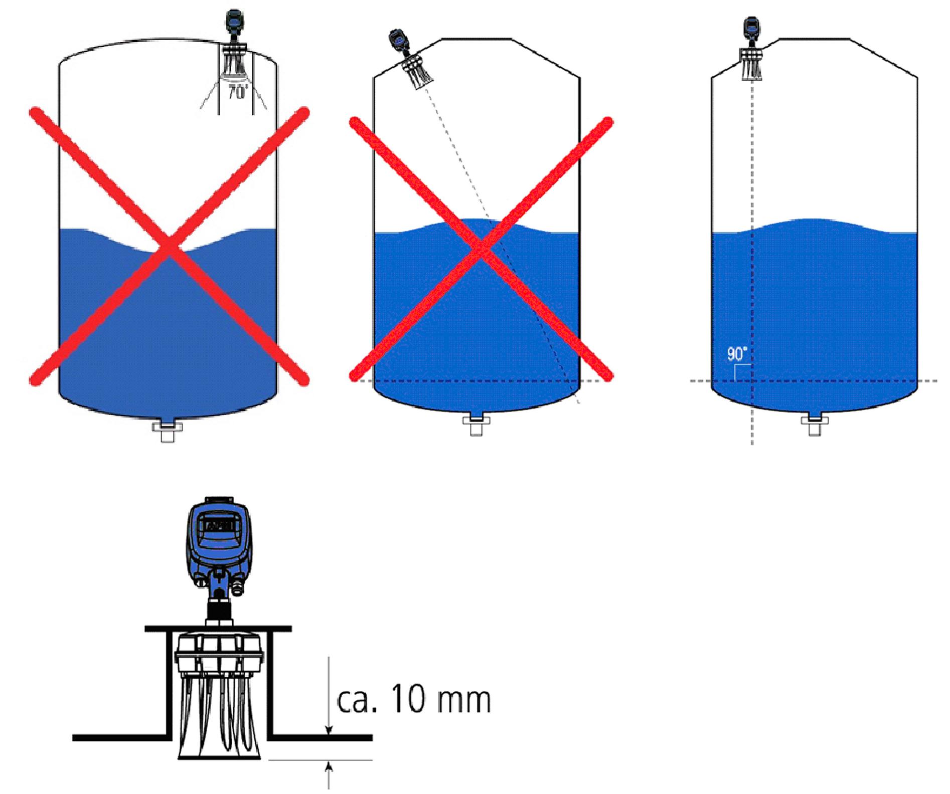 正確的安裝位置為:離罐壁距離為罐直徑1/6處,最小距離為500mm。 不可安裝在入料口上方。 盡可能避免罐內障礙物,如開關,儀表,加熱線圈,真空環和擋板等等 喇叭口進入料倉不小于10mm 必須垂直安裝于料倉 |
